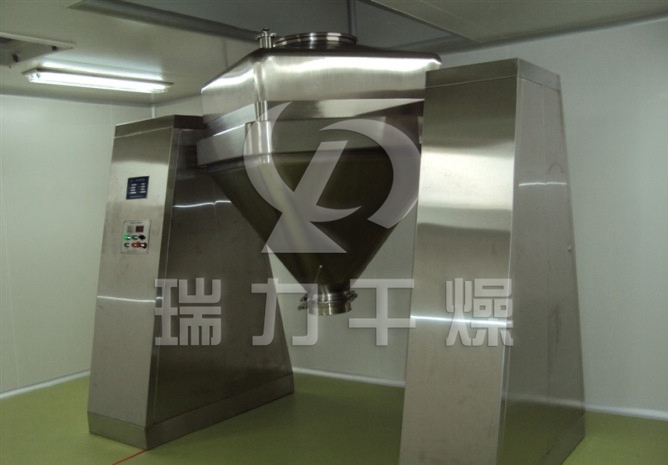 將物料裝入方錐形密閉混合桶內(nèi),料斗對稱的軸線與回轉(zhuǎn)軸軸線成一夾角,不同組分物料在密閉的料斗中進行三維空間運動,產(chǎn)生強烈翻轉(zhuǎn)和擴散收縮作用,達到好的混合效果。