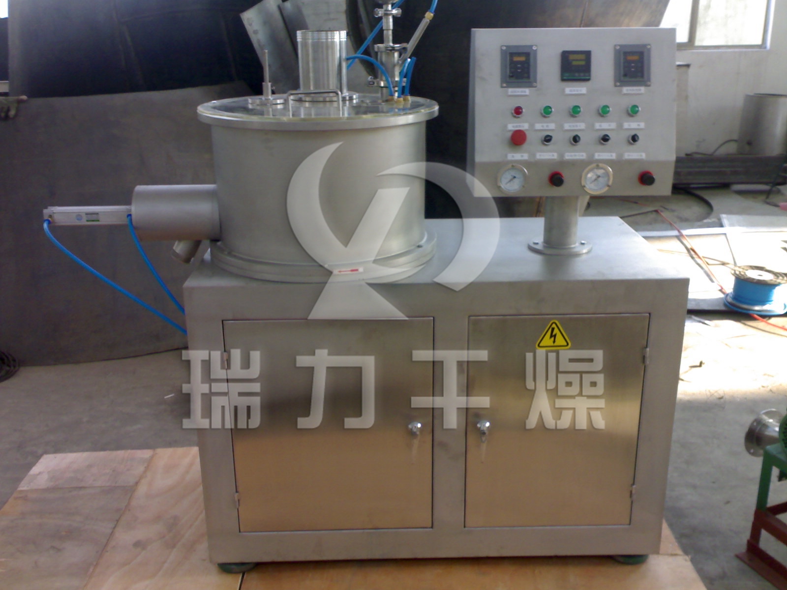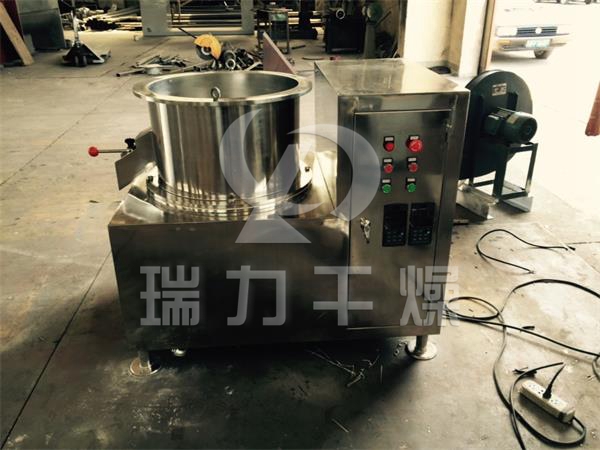 本機(jī)是通過(guò)設(shè)置旋轉(zhuǎn)離心盤(pán)、鼓風(fēng)機(jī)、氣動(dòng)噴槍?zhuān)瑢耦w粒制成美麗的球丸。將前道工序做成的濕顆粒投入旋轉(zhuǎn)離心盤(pán)內(nèi),啟動(dòng)鼓風(fēng)機(jī)后再將旋轉(zhuǎn)離心盤(pán)啟動(dòng),使?jié)耦w粒受到環(huán)隙空氣浮力、旋轉(zhuǎn)離心力、自身重力作用,呈環(huán)周繩股狀運(yùn)動(dòng),從而形成真球度極高的球丸。