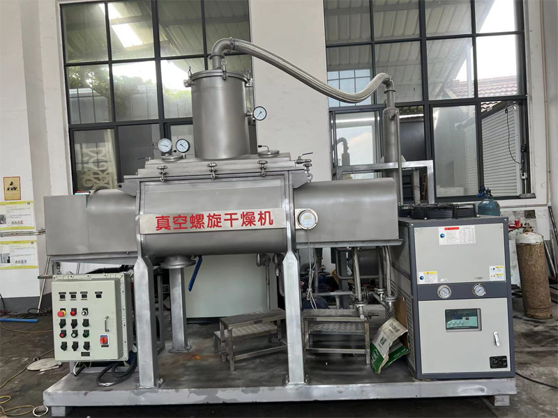 ??真空螺旋干燥機經(jīng)過內(nèi)部空心葉片結(jié)構(gòu)方式,使物料在箱體內(nèi)部充分循環(huán)流動,充分增加物料接觸熱能,干燥的物料更均勻、無死角殘留,熱能傳遞采用空心葉片以及箱體壁面熱能,物料被熱能包裹流動,熱能幾乎無損耗,整體設(shè)備采用密封工作方式,防止粉塵、氣味,無外泄,利用后期冷凝回收裝置,回收可利用資源以及污染物,從而達到無污染排放,根據(jù)物料對溫度的要求,可采用不同的加熱介質(zhì):蒸汽、熱水、導(dǎo)熱油,根據(jù)物料不同,加料方式可采用一次和分多次加入,干燥結(jié)束后排泄真空后通過出料伐開啟出料。