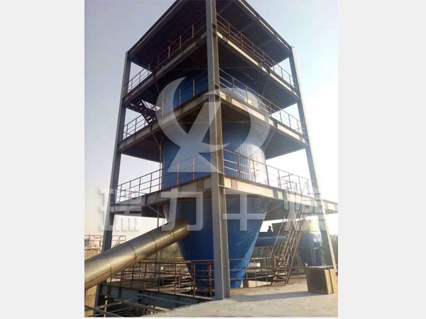 工作時物料液通過隔膜泵高壓輸入,噴出霧狀液滴,然后同熱空氣并流下降,大部分粉粒由塔底排料口收集,廢氣及其微小粉末經旋風分離器分離,廢氣由抽風機排出,粉末由設在旋風分離器下端的授粉筒收集,風機出口還可裝備二級除塵裝置,回收率在96-98%以上。